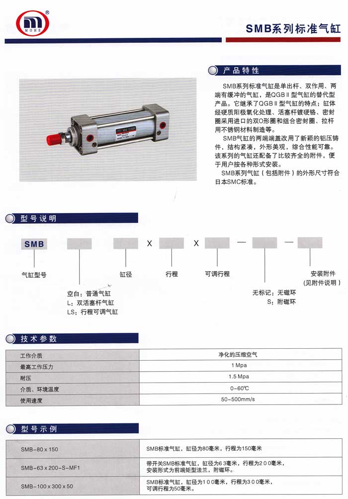 產(chǎn)品名稱:SMB系列氣缸,MOHE CYLINDER,MOHE氣缸,MOHE手動閥,磨合氣缸,MOHE接頭 |