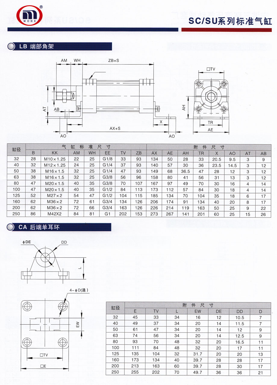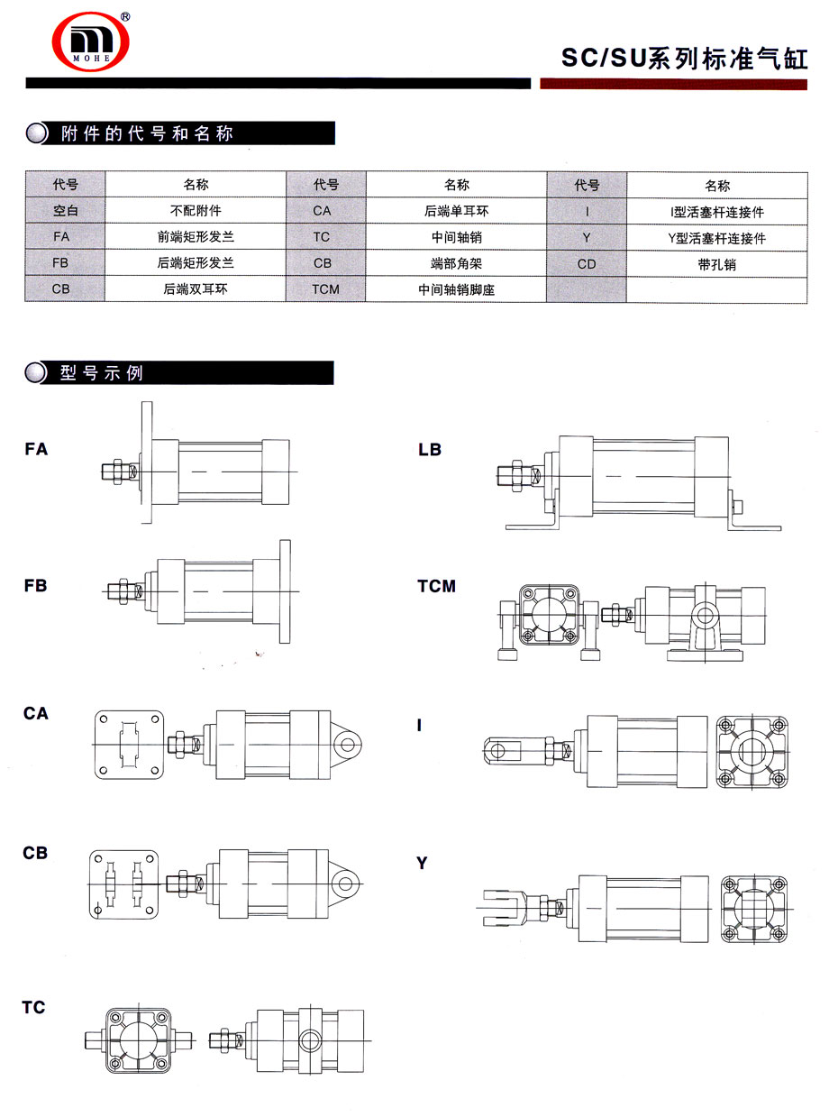 備注:單出桿、雙作用、兩端有緩沖缸體經(jīng)硬質(zhì)陽極氧化處理、活塞桿鍍硬鉻、密封圈采用進口的雙o形圈和組合密封圈有多種安裝附件供客戶選擇氣缸活塞上可以安裝永久磁鐵 有,SC/SU系列標準氣缸,MOHE CYLINDER,MOHE氣缸