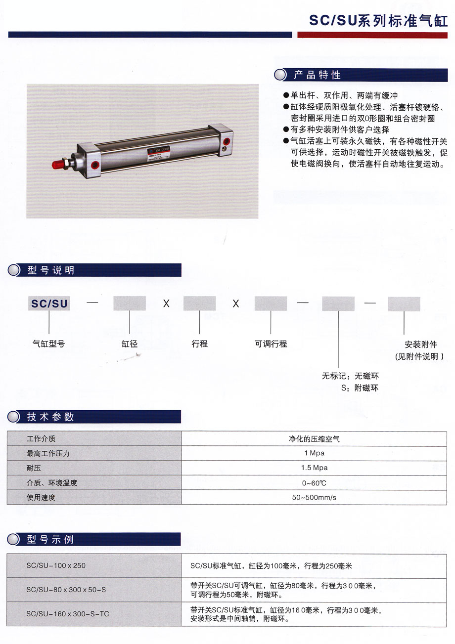 代號:SC/SU 規(guī)格:工作介質(zhì):凈化的壓縮空氣;最高工作壓力:1Mpa;耐壓:1.5Mpa介質(zhì)環(huán)境溫度:0-60℃;使用速度:50-500mm/s